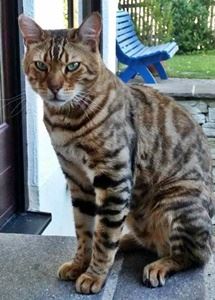 TJAGO ist ein Bengalkater und 3 Jahre alt. Seine Fellfarbe ist black spotted tabby mit der für Bengalkatzen typischen Leopardenzeichnung und langen Beinen. TJAGO ist Freigänger und Fremden gegenüber sehr zutraulich (er geht auch in fremde Häuser und Wohnungen). TJAGO wurde letztes Jahr bereits zwei Mal vermisst. Sein Revier war bisher vom Friedhof Ottobrunn und Umgebung des Isar-Centers bis zum Industriegebiet Finsinger Feld am Landschaftspark Neubiberg.