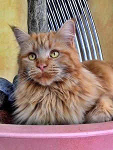 Kater BUDDY ist ein Maine Coon-Kater und 2 Jahre alt. Er hat ein langes rötliches Fell mit hellerer Schwanzspitze. BUDDY ist Freigänger und sehr zutraulich und aufgeschlossen gegenüber fremden Personen.