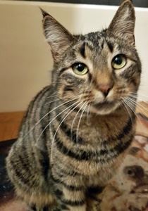 FELIX ist 3 Jahre alt. Sie hat ein grau-schwarz getigertes Fell mit hellerem Schnauzen/Kinnbereich. Auffallend sind ihre schwarze Schwanzspitze sowie zwei breite schwarze Streifen an ihren Vorderbeinen. FELIX ist Freigängerin und ist Fremden gegenüber zutraulich.