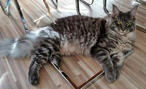 Kater OLLI ist ein 1,5 Jahre alter Maine-Coon-Kater mit grau-schwarz getigertem Fell. Er hat eine hellere Brust, einen hellen Schnauzenbereich sowie einen buschigen Schwanz. OLLI ist Freigänger und fremden Personen gegenüber eher scheu.